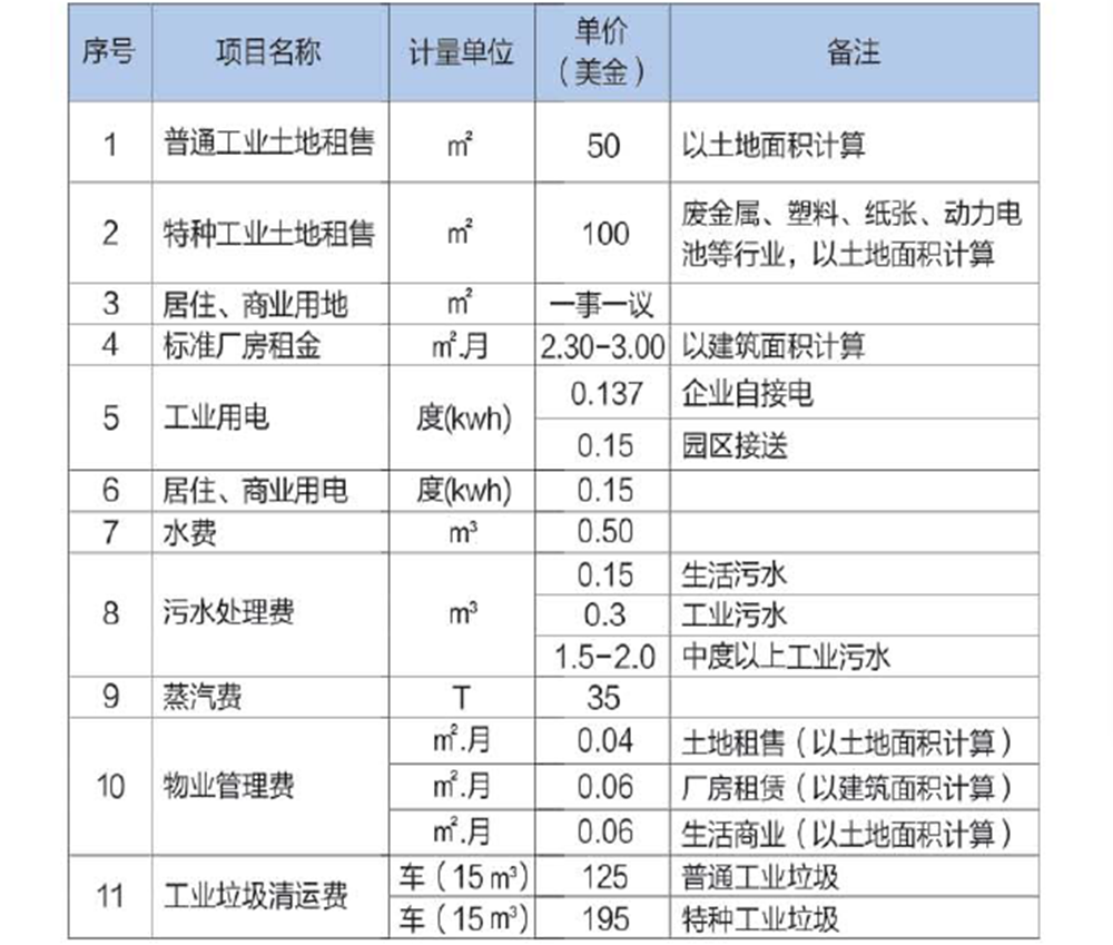 1、 电价:园区工业电价为0.137美元/度,相较周边国家如越南略高,但稳定性佳,部分园区支持独立配电。