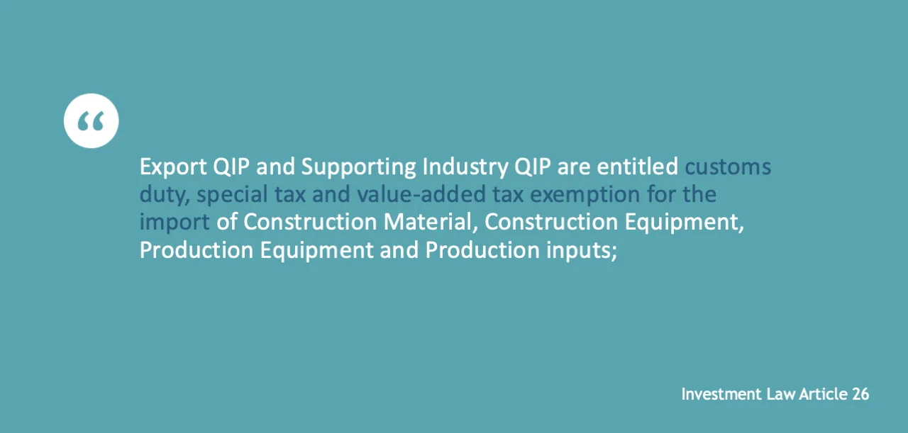 - 对用于投资项目建设的设备、机械、建筑材料、原材料等,可享受进口关税与增值税双免。