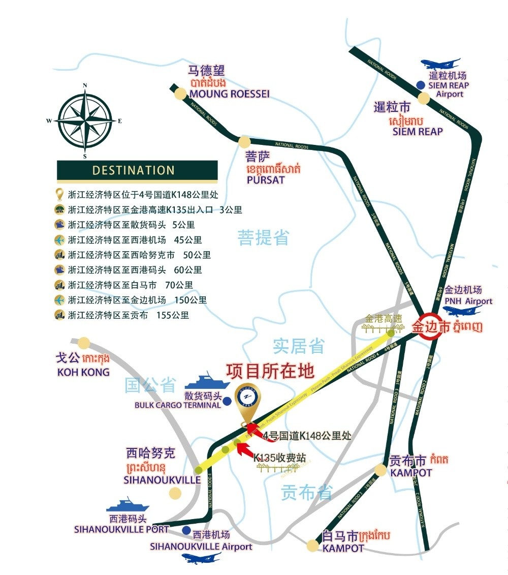 空运:特区二期距柬埔寨第一大国际机场金边机场150公里,距第三大国际机场西哈努克机场约60公里。