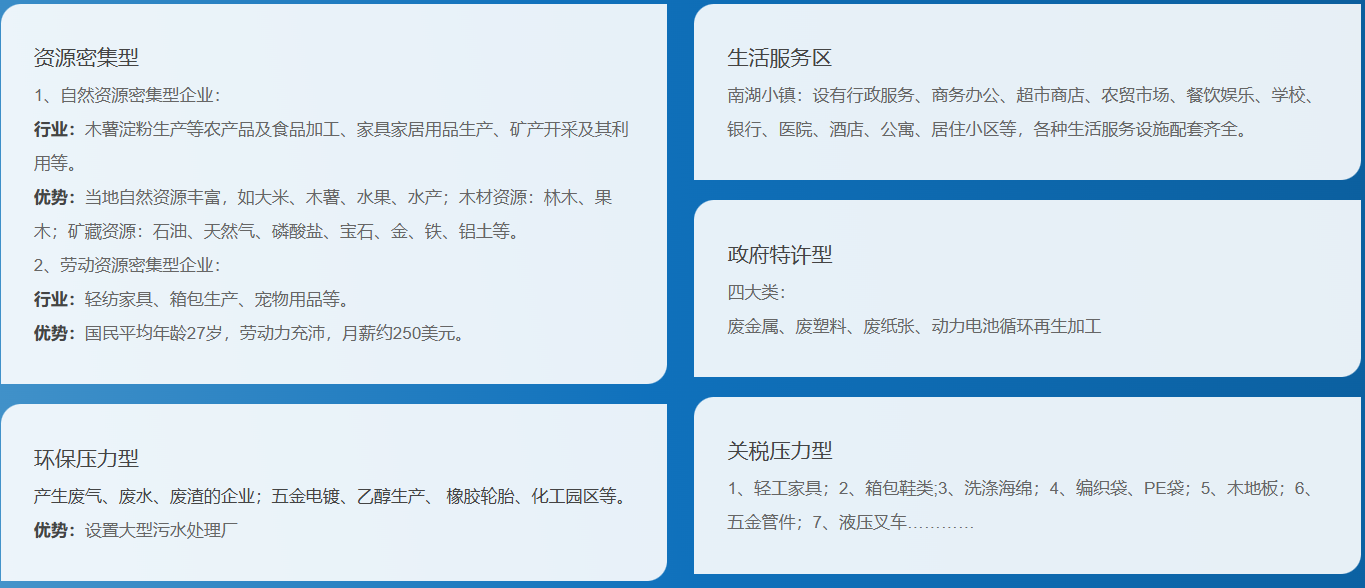 1、资源密集型:木薯淀粉生产等农产品及食品加工,家具家居用品生产,矿产开采及其利用