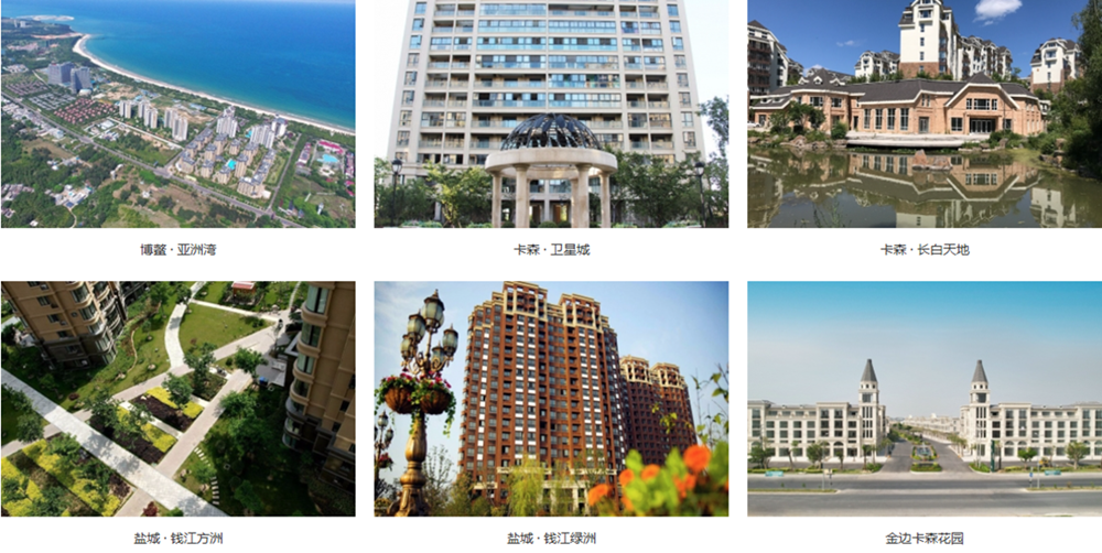 集团现有江苏盐城钱江方洲、钱江绿洲,浙江海宁卡森卫星城、海南博鳌亚洲湾、海南三亚凤凰山度假区、长白山长白天地度假区等项目,土地储备近5000亩,开发建筑面积300万平方米。